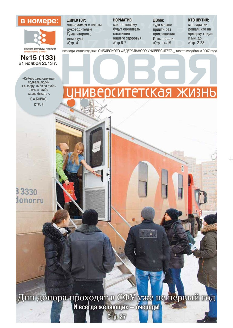 Новая университетская жизнь : газета/ Сиб. федер. ун-т. - Красноярск, 2007 - . - ISSN 2222-5560 2013г. N 15 (133) (21 ноября) Полный текст ( 1.3 Мб; PDF). Ресурс свободного доступа