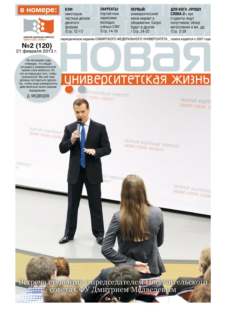Новая университетская жизнь : газета/ Сиб. федер. ун-т. - Красноярск, 2007 - . - ISSN 2222-5560 2013г. N 2 (120) (21 февраля) Полный текст ( 3.3 Мб; PDF). Ресурс свободного доступа