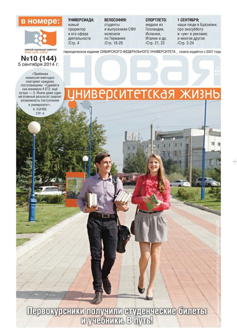 Новая университетская жизнь : газета/ Сиб. федер. ун-т. - Красноярск, 2007 - . - ISSN 2222-5560 2014г. N 10 (144) (5 сентября) Полный текст ( 4.0 Мб; PDF). Ресурс свободного доступа
