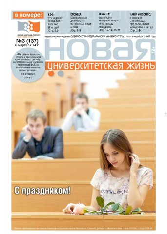 Новая университетская жизнь : газета/ Сиб. федер. ун-т. - Красноярск, 2007 - . - ISSN 2222-5560 2014г. N 3 (137) (6 марта) Полный текст ( 3.3 Мб; PDF). Ресурс свободного доступа