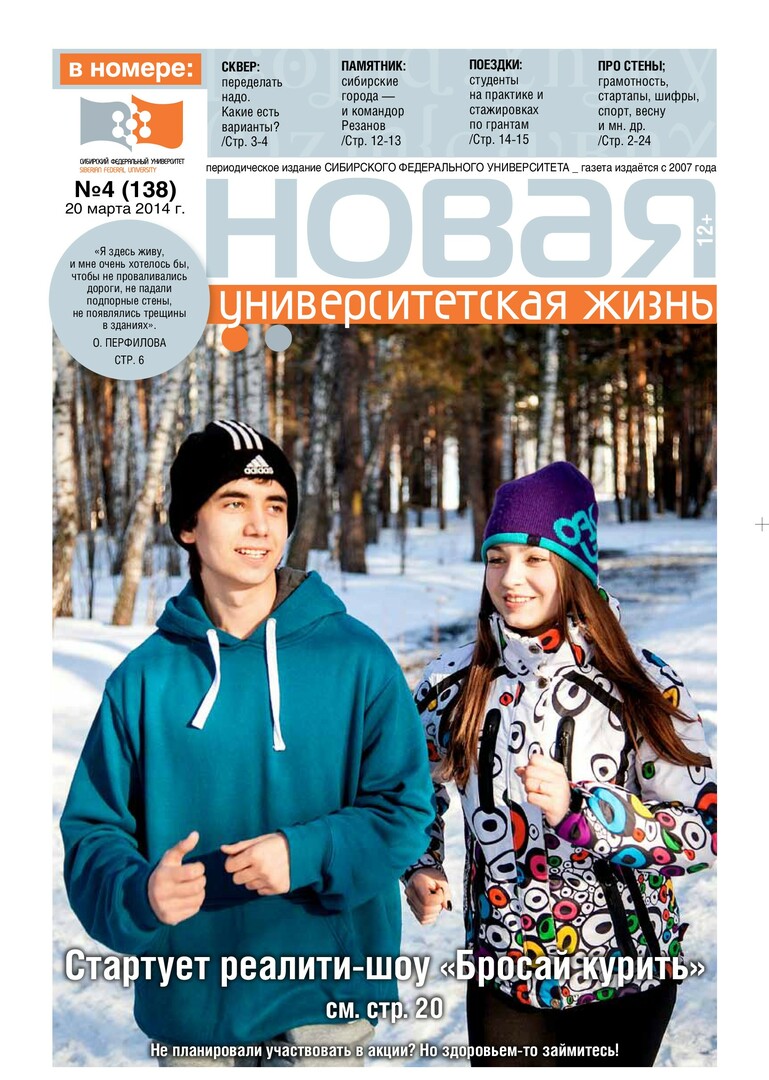 Новая университетская жизнь : газета/ Сиб. федер. ун-т. - Красноярск, 2007 - . - ISSN 2222-5560 2014г. N 4 (138) (20 марта) Полный текст ( 1.2 Мб; PDF). Ресурс свободного доступа