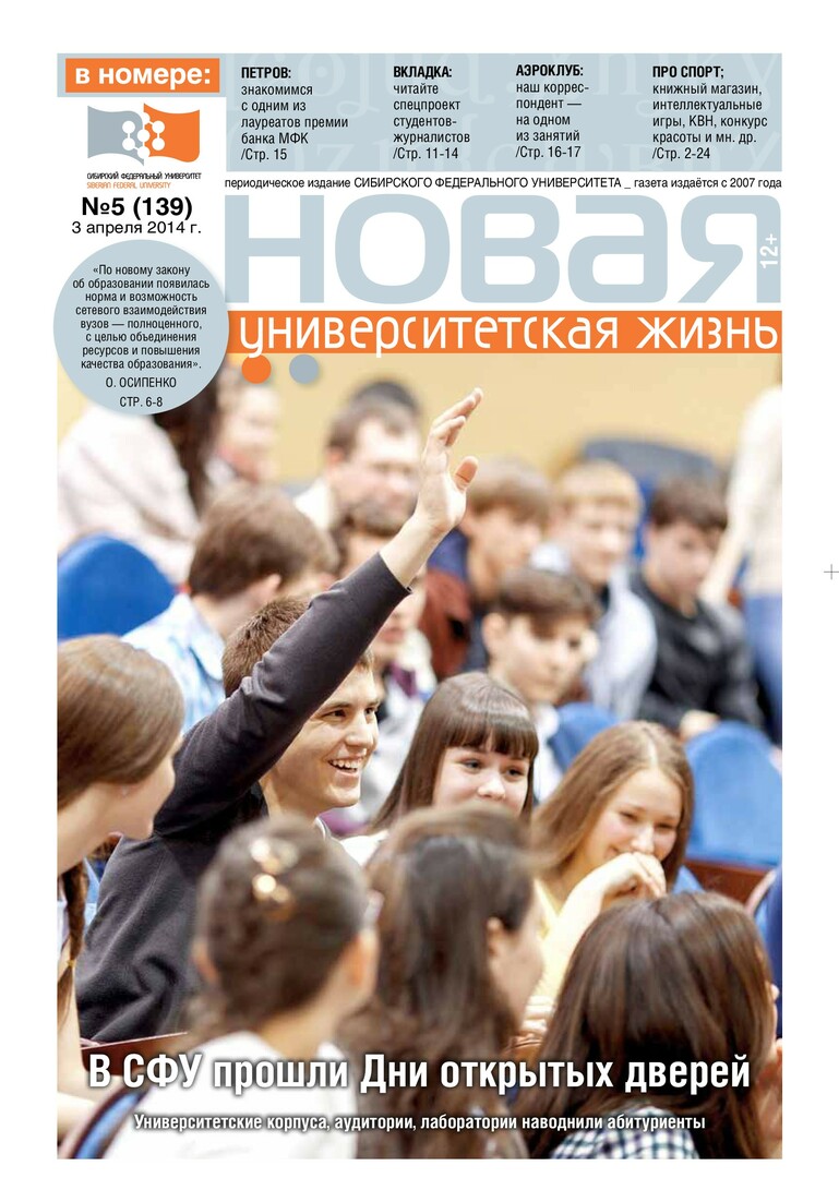 Новая университетская жизнь : газета/ Сиб. федер. ун-т. - Красноярск, 2007 - . - ISSN 2222-5560 2014г. N 5 (139) (3 апреля) Полный текст ( 4.2 Мб; PDF). Ресурс свободного доступа