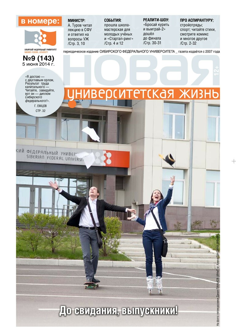 Новая университетская жизнь : газета/ Сиб. федер. ун-т. - Красноярск, 2007 - . - ISSN 2222-5560 2014г. N 9 (143) (5 июня) Полный текст ( 2.5 Мб; PDF). Ресурс свободного доступа