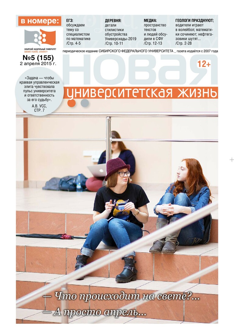Новая университетская жизнь : газета/ Сиб. федер. ун-т. - Красноярск, 2007 - . - ISSN 2222-5560 2015г. N 5 (155) (2 апреля) Полный текст ( 3.4 Мб; PDF). Ресурс свободного доступа