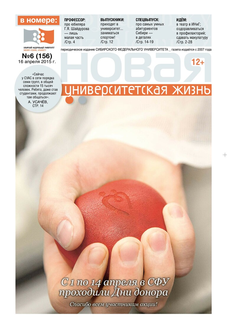 Новая университетская жизнь : газета/ Сиб. федер. ун-т. - Красноярск, 2007 - . - ISSN 2222-5560 2015г. N 6 (156) (16 апреля) Полный текст ( 2.4 Мб; PDF). Ресурс свободного доступа
