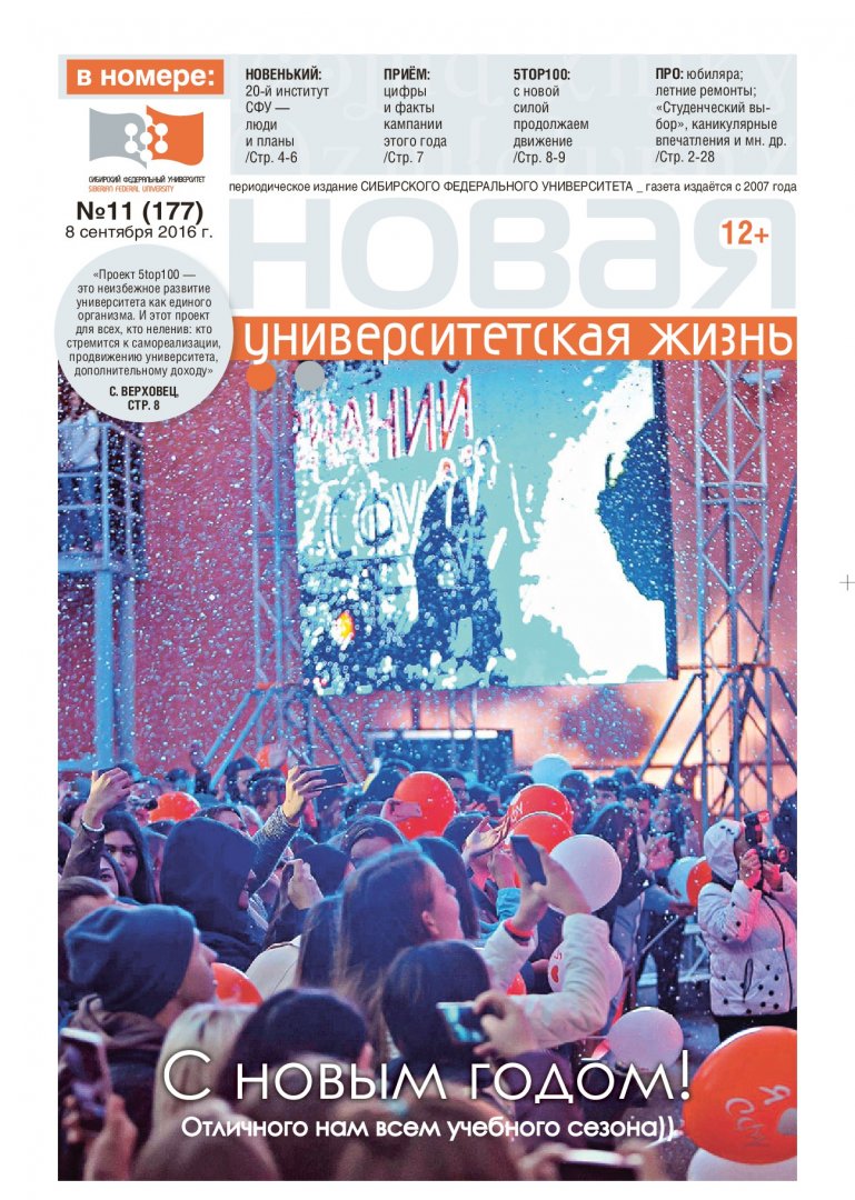 Новая университетская жизнь : газета/ Сиб. федер. ун-т. - Красноярск, 2007 - . - ISSN 2222-5560 2016г. N 11 (177) (8 сентября) Полный текст ( 3.1 Мб; PDF). Ресурс свободного доступа