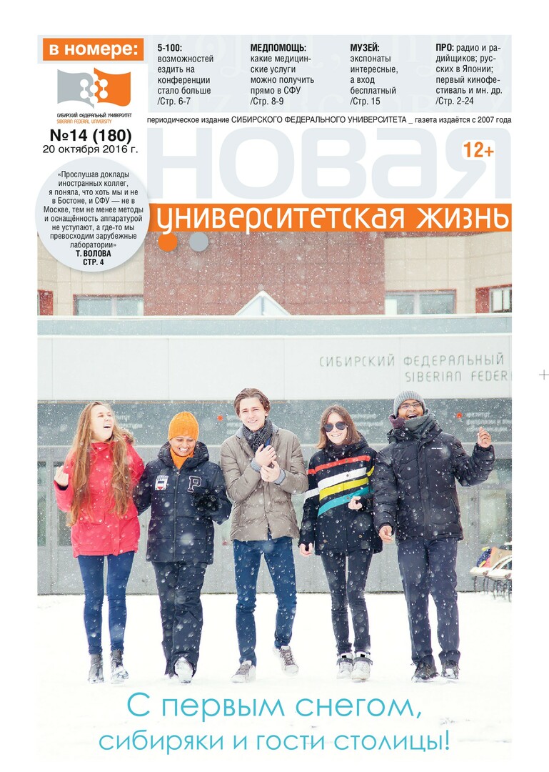 Новая университетская жизнь : газета/ Сиб. федер. ун-т. - Красноярск, 2007 - . - ISSN 2222-5560 2016г. N 14 (180) (20 октября) Полный текст ( 4.0 Мб; PDF). Ресурс свободного доступа