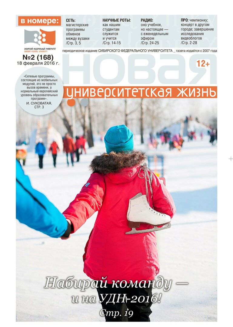 Новая университетская жизнь : газета/ Сиб. федер. ун-т. - Красноярск, 2007 - . - ISSN 2222-5560 2016г. N 2 (168) (18 февраля) Полный текст ( 4.4 Мб; PDF). Ресурс свободного доступа