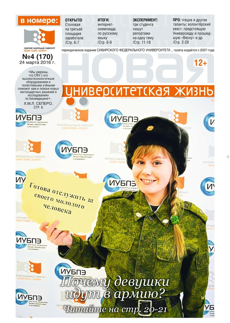 Новая университетская жизнь : газета/ Сиб. федер. ун-т. - Красноярск, 2007 - . - ISSN 2222-5560 2016г. N 4 (170) (24 марта) Полный текст ( 3.4 Мб; PDF). Ресурс свободного доступа