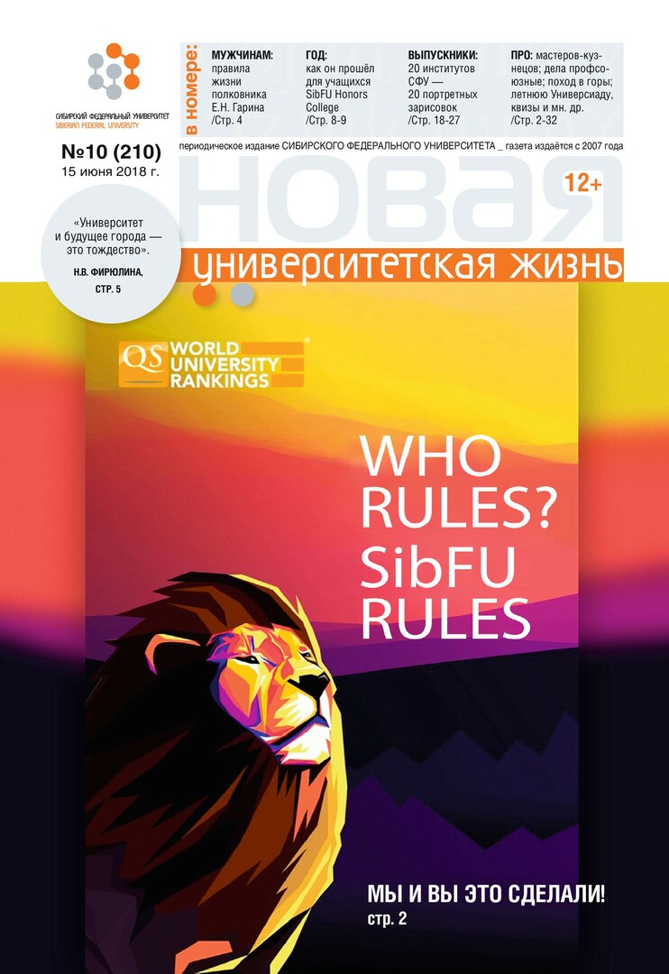 Новая университетская жизнь : газета/ Сиб. федер. ун-т. - Красноярск, 2007 - . - ISSN 2222-5560 2018г. N 10 (210) (15 июня) Полный текст ( 7.1 Мб; PDF). Ресурс свободного доступа
