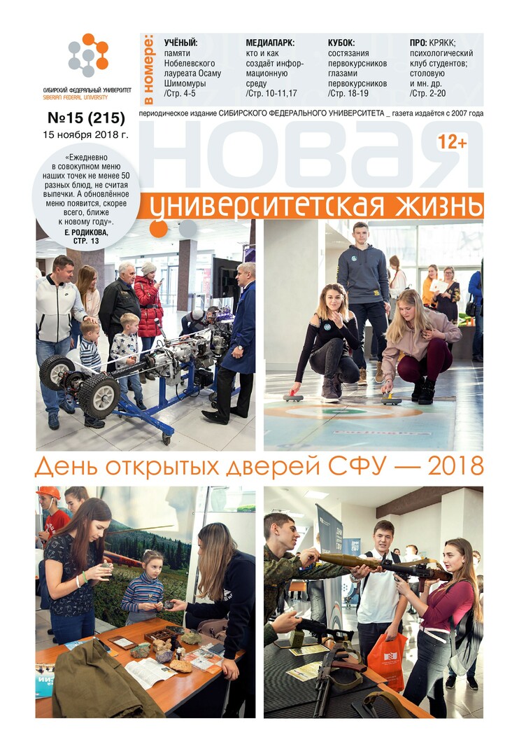Новая университетская жизнь : газета/ Сиб. федер. ун-т. - Красноярск, 2007 - . - ISSN 2222-5560 2018г. N 15 (215) (15 ноября) Полный текст ( 3.9 Мб; PDF). Ресурс свободного доступа