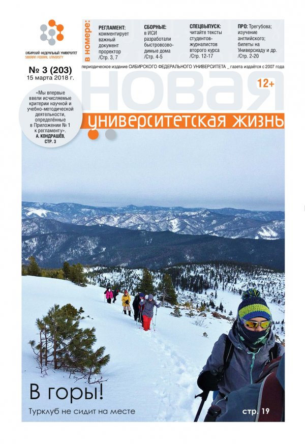 Новая университетская жизнь : газета/ Сиб. федер. ун-т. - Красноярск, 2007 - . - ISSN 2222-5560 2018г. N 3 (203) (15 марта) Полный текст ( 2.6 Мб; PDF). Ресурс свободного доступа