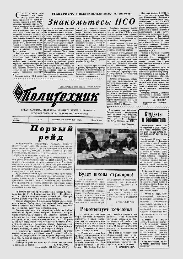 Политехник : газета/ Краснояр. политех. ин-т. - Красноярск : КГТУ, 1964 - - 2006 1964г. N 4 (24 ноября) http://lib3.sfu-kras.ru/ft/LIB2/ELIB_DC/SFUPRSV/sfupol/1964/1964_11_24_0004.pdf