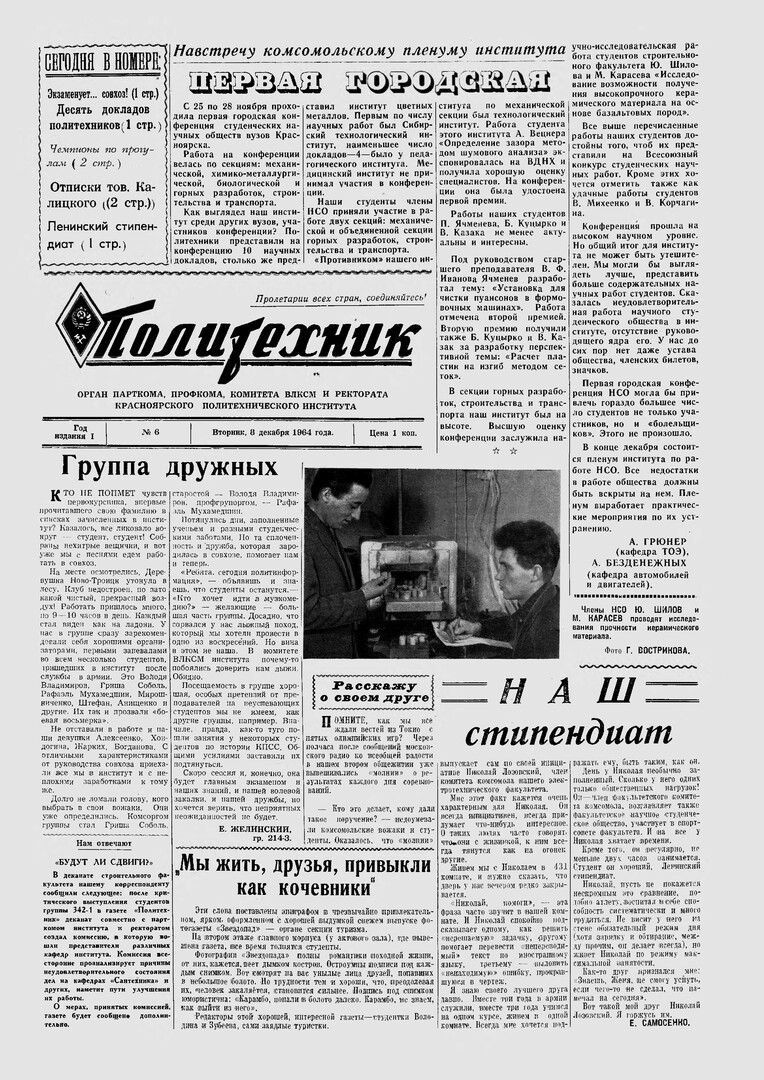 Политехник : газета/ Краснояр. политех. ин-т. - Красноярск : КГТУ, 1964 - - 2006 1964г. N 6 (8 декабря) http://lib3.sfu-kras.ru/ft/LIB2/ELIB_DC/SFUPRSV/sfupol/1964/1964_12_08_0006.pdf