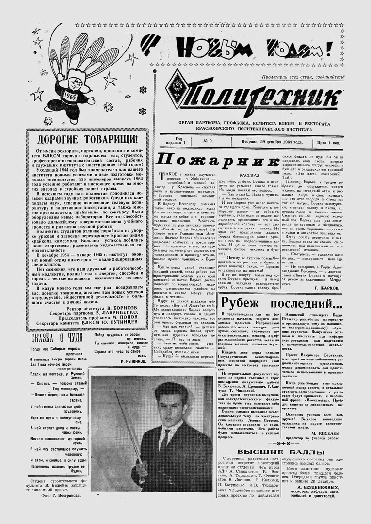 Политехник : газета/ Краснояр. политех. ин-т. - Красноярск : КГТУ, 1964 - - 2006 1964г. N 9 (29 декабря) http://lib3.sfu-kras.ru/ft/LIB2/ELIB_DC/SFUPRSV/sfupol/1964/1964_12_29_0009.pdf