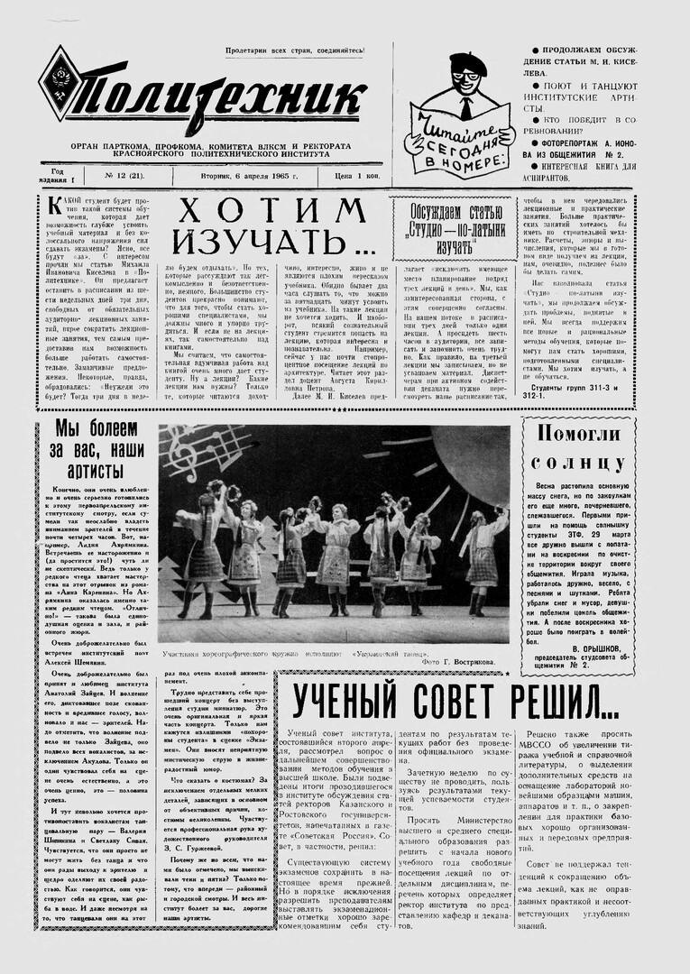 Политехник : газета/ Краснояр. политех. ин-т. - Красноярск : КГТУ, 1964 - - 2006 1965г. N 12 (21) (6 апреля) http://lib3.sfu-kras.ru/ft/LIB2/ELIB_DC/SFUPRSV/sfupol/1965/1965_04_06_0021.pdf