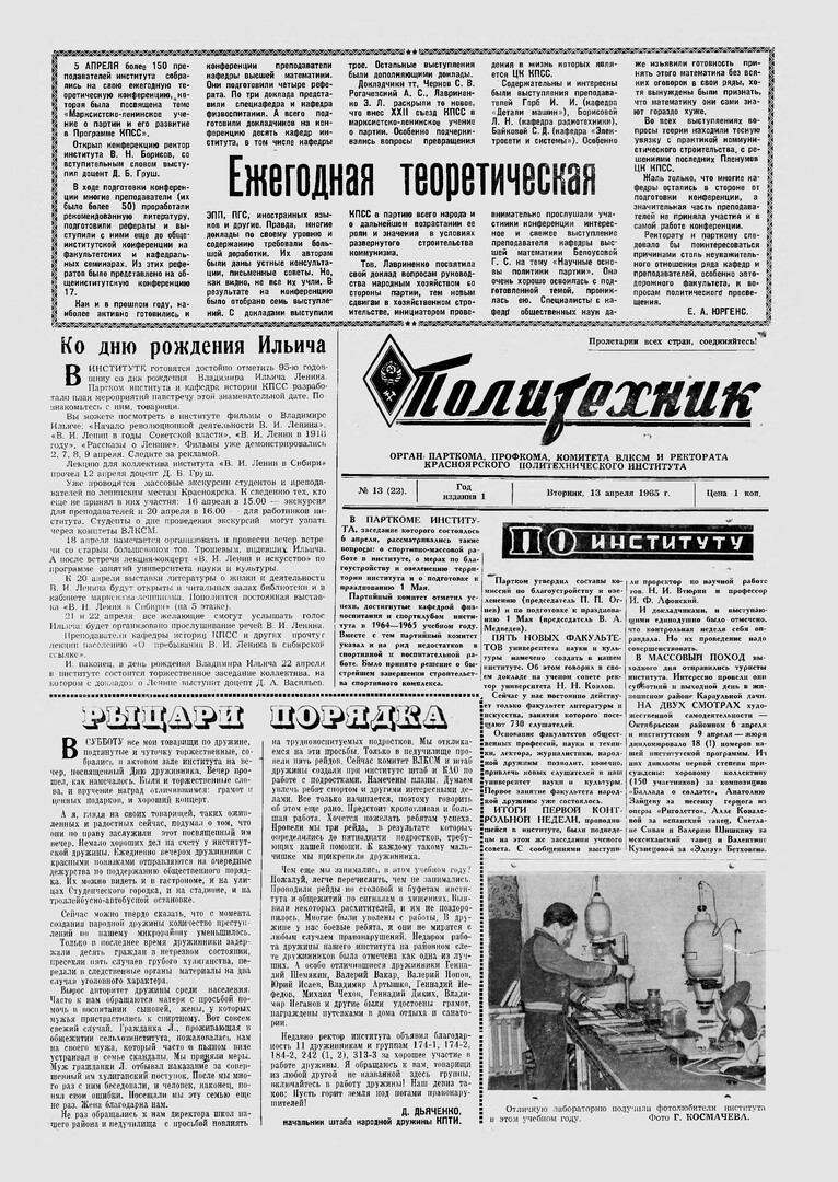 Политехник : газета/ Краснояр. политех. ин-т. - Красноярск : КГТУ, 1964 - - 2006 1965г. N 13 (22) (13 апреля) http://lib3.sfu-kras.ru/ft/LIB2/ELIB_DC/SFUPRSV/sfupol/1965/1965_04_13_0022.pdf