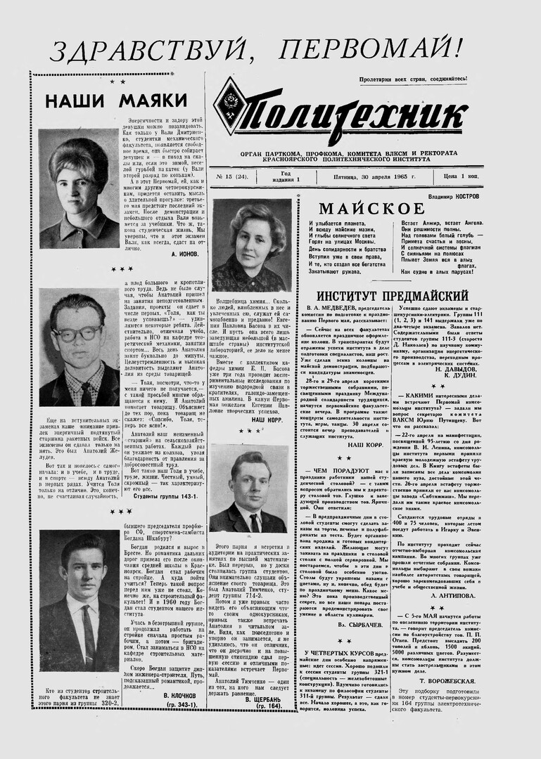 Политехник : газета/ Краснояр. политех. ин-т. - Красноярск : КГТУ, 1964 - - 2006 1965г. N 15(24) (30 апреля) http://lib3.sfu-kras.ru/ft/LIB2/ELIB_DC/SFUPRSV/sfupol/1965/1965_04_30_0024.pdf