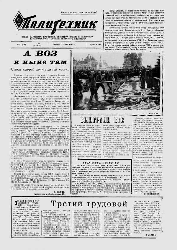 Политехник : газета/ Краснояр. политех. ин-т. - Красноярск : КГТУ, 1964 - - 2006 1965г. N 17 (26) (13 мая) http://lib3.sfu-kras.ru/ft/LIB2/ELIB_DC/SFUPRSV/sfupol/1965/1965_05_13_0026.pdf