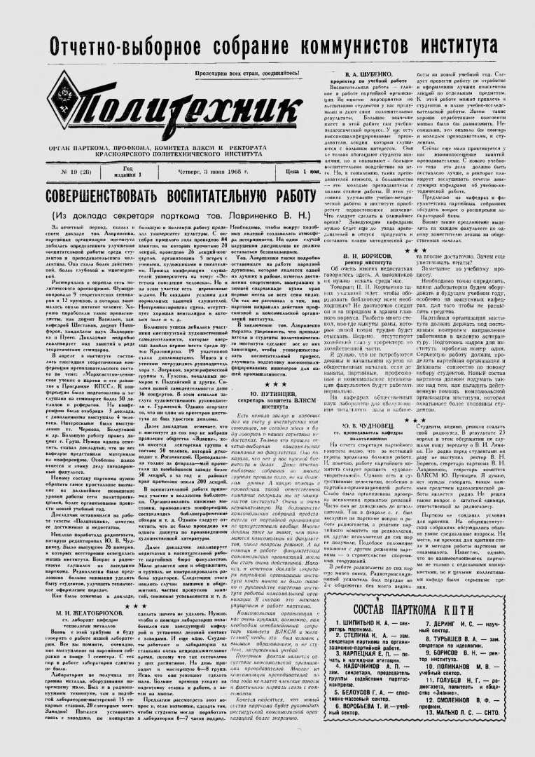 Политехник : газета/ Краснояр. политех. ин-т. - Красноярск : КГТУ, 1964 - - 2006 1965г. N 19 (28) (3 июня) http://lib3.sfu-kras.ru/ft/LIB2/ELIB_DC/SFUPRSV/sfupol/1965/1965_06_03_0028.pdf