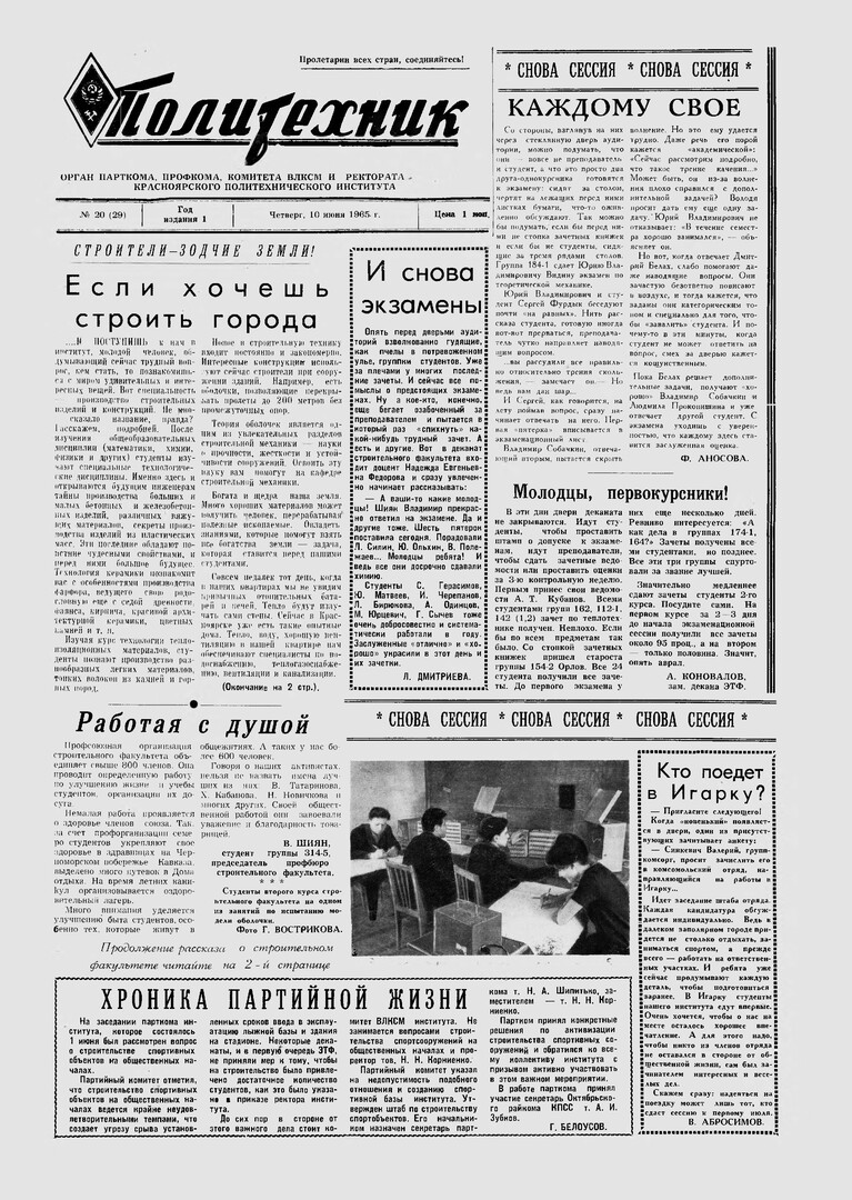 Политехник : газета/ Краснояр. политех. ин-т. - Красноярск : КГТУ, 1964 - - 2006 1965г. N 20 (29) (10 июня) http://lib3.sfu-kras.ru/ft/LIB2/ELIB_DC/SFUPRSV/sfupol/1965/1965_06_10_0029.pdf