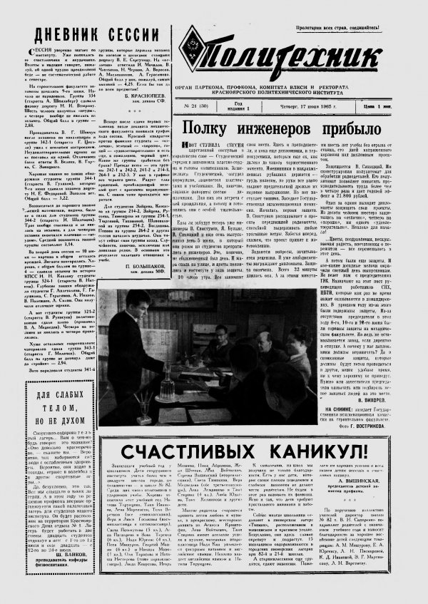 Политехник : газета/ Краснояр. политех. ин-т. - Красноярск : КГТУ, 1964 - - 2006 1965г. N 21 (30) (17 июня) http://lib3.sfu-kras.ru/ft/LIB2/ELIB_DC/SFUPRSV/sfupol/1965/1965_06_17_0030.pdf