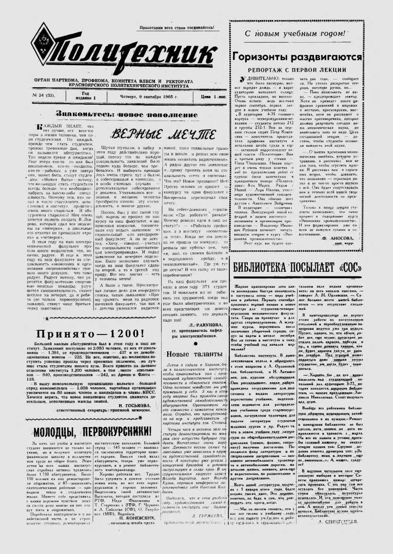 Политехник : газета/ Краснояр. политех. ин-т. - Красноярск : КГТУ, 1964 - - 2006 1965г. N 24 (33) (9 сентября) http://lib3.sfu-kras.ru/ft/LIB2/ELIB_DC/SFUPRSV/sfupol/1965/1965_09_09_0033.pdf