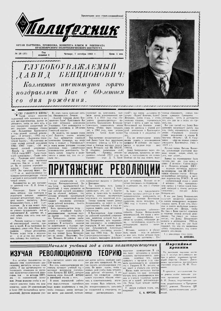 Политехник : газета/ Краснояр. политех. ин-т. - Красноярск : КГТУ, 1964 - - 2006 1965г. N 28 (37) (7 октября) http://lib3.sfu-kras.ru/ft/LIB2/ELIB_DC/SFUPRSV/sfupol/1965/1965_10_07_0037.pdf