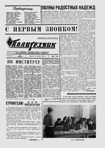 Политехник : газета/ Краснояр. политех. ин-т. - Красноярск : КГТУ, 1964 - - 2006 1965г. N 29 (38) (13 октября) http://lib3.sfu-kras.ru/ft/LIB2/ELIB_DC/SFUPRSV/sfupol/1965/1965_10_13_0038.pdf