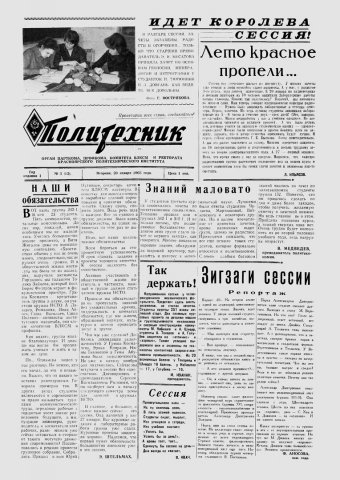 Политехник : газета/ Краснояр. политех. ин-т. - Красноярск : КГТУ, 1964 - - 2006 1965г. N 3 (12) (26 января) http://lib3.sfu-kras.ru/ft/LIB2/ELIB_DC/SFUPRSV/sfupol/1965/1965_01_26_0012.pdf
