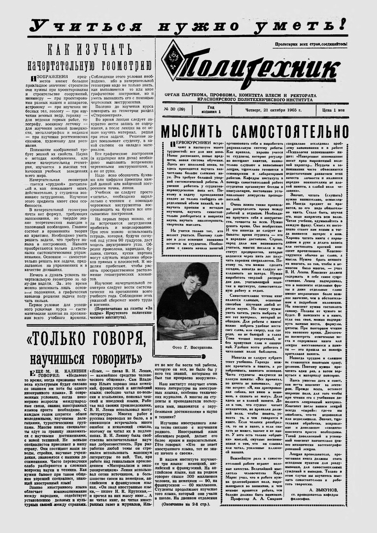 Политехник : газета/ Краснояр. политех. ин-т. - Красноярск : КГТУ, 1964 - - 2006 1965г. N 30 (39) (21 октября) http://lib3.sfu-kras.ru/ft/LIB2/ELIB_DC/SFUPRSV/sfupol/1965/1965_10_21_0039.pdf