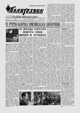 Политехник : газета/ Краснояр. политех. ин-т. - Красноярск : КГТУ, 1964 - - 2006 1965г. N 31 (40) (28 октября) http://lib3.sfu-kras.ru/ft/LIB2/ELIB_DC/SFUPRSV/sfupol/1965/1965_10_28_0040.pdf