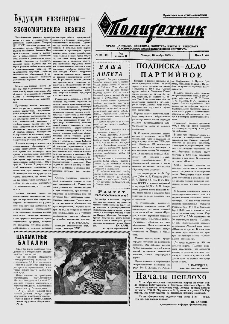Политехник : газета/ Краснояр. политех. ин-т. - Красноярск : КГТУ, 1964 - - 2006 1965г. N 34 (43) (18 ноября) http://lib3.sfu-kras.ru/ft/LIB2/ELIB_DC/SFUPRSV/sfupol/1965/1965_11_18_0043.pdf