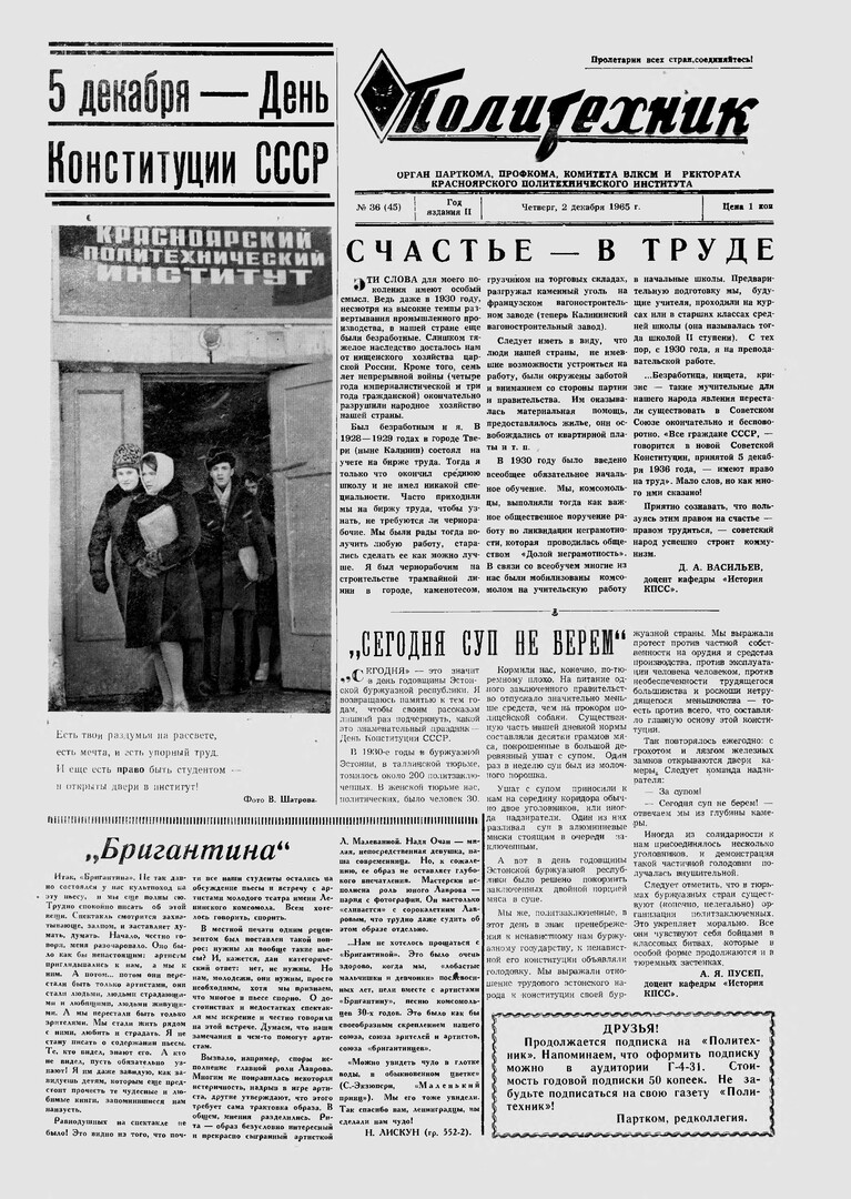 Политехник : газета/ Краснояр. политех. ин-т. - Красноярск : КГТУ, 1964 - - 2006 1965г. N 36 (45) (2 декабря) http://lib3.sfu-kras.ru/ft/LIB2/ELIB_DC/SFUPRSV/sfupol/1965/1965_12_02_0045.pdf