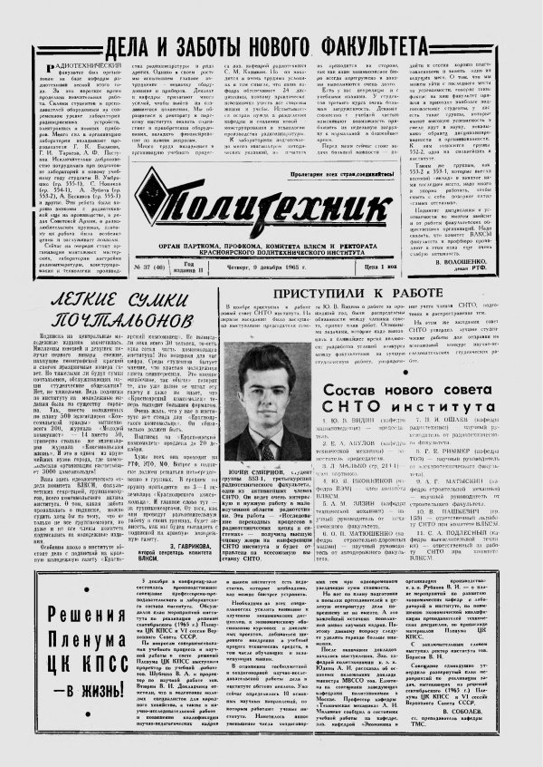 Политехник : газета/ Краснояр. политех. ин-т. - Красноярск : КГТУ, 1964 - - 2006 1965г. N 37 (46) (9 декабря) http://lib3.sfu-kras.ru/ft/LIB2/ELIB_DC/SFUPRSV/sfupol/1965/1965_12_09_0046.pdf