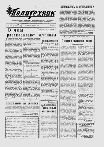 Политехник : газета/ Краснояр. политех. ин-т. - Красноярск : КГТУ, 1964 - - 2006 1965г. N 38 (47) (16 декабря) http://lib3.sfu-kras.ru/ft/LIB2/ELIB_DC/SFUPRSV/sfupol/1965/1965_12_16_0047.pdf