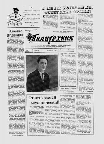 Политехник : газета/ Краснояр. политех. ин-т. - Красноярск : КГТУ, 1964 - - 2006 1965г. N 6 (15) (23 февраля) http://lib3.sfu-kras.ru/ft/LIB2/ELIB_DC/SFUPRSV/sfupol/1965/1965_02_23_0015.pdf
