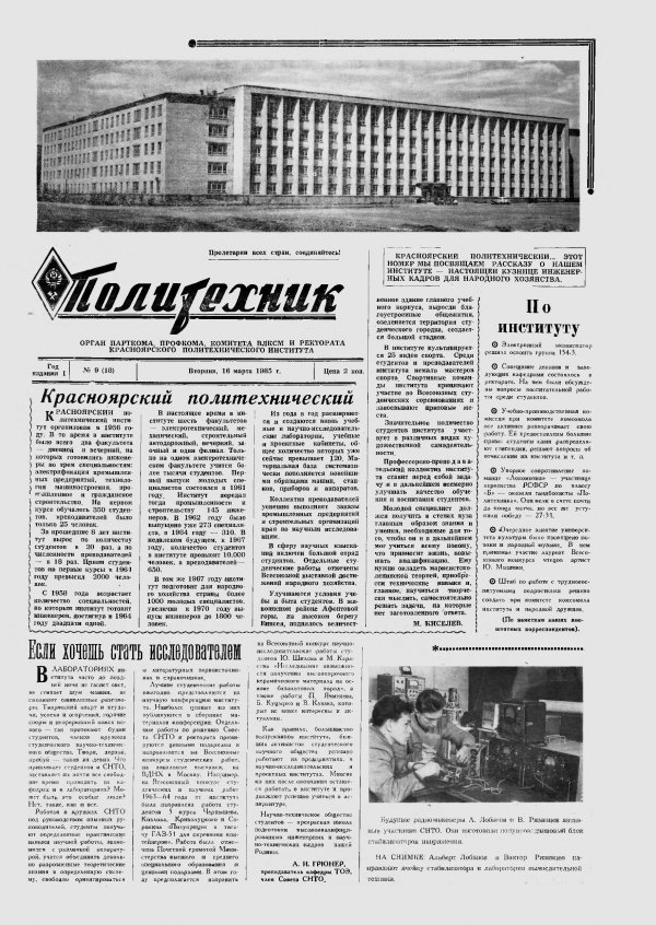 Политехник : газета/ Краснояр. политех. ин-т. - Красноярск : КГТУ, 1964 - - 2006 1965г. N 9 (18) (16 марта) http://lib3.sfu-kras.ru/ft/LIB2/ELIB_DC/SFUPRSV/sfupol/1965/1965_03_16_0018.pdf
