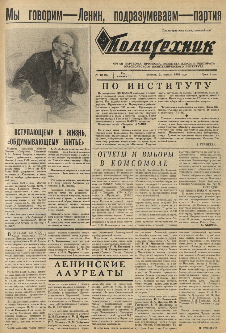 Политехник : газета. 1966 г. № 13 (62) (21 апреля)