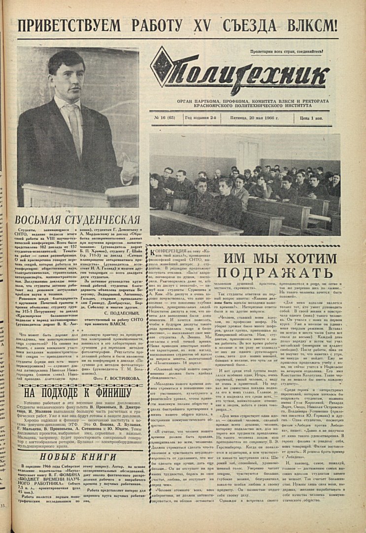 Политехник : газета. 1966 г. № 16 (65) (20 мая)