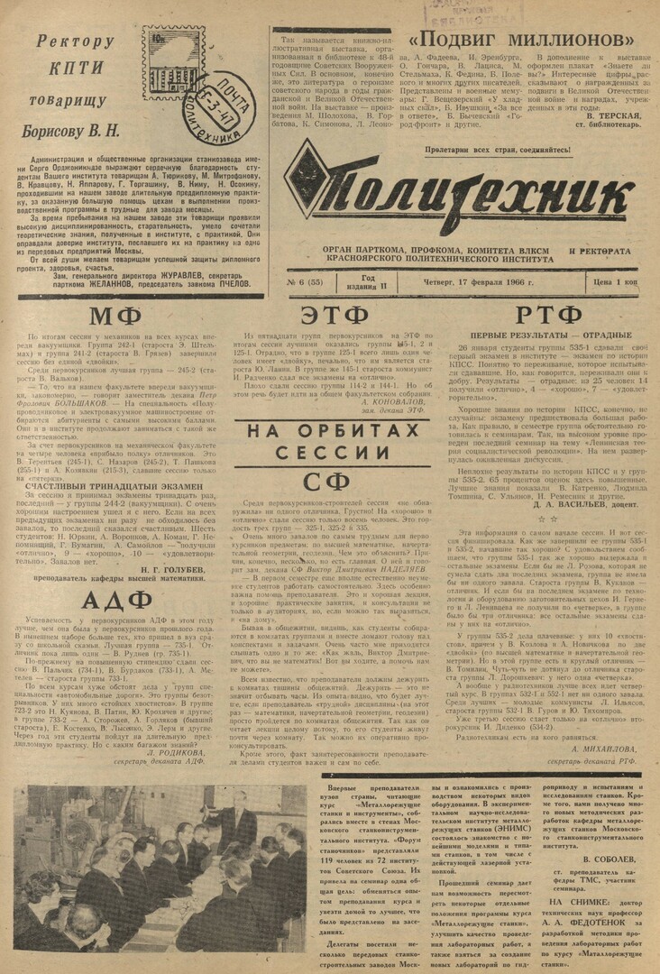 Политехник : газета. 1966 г. № 6 (55) (17 февраля)