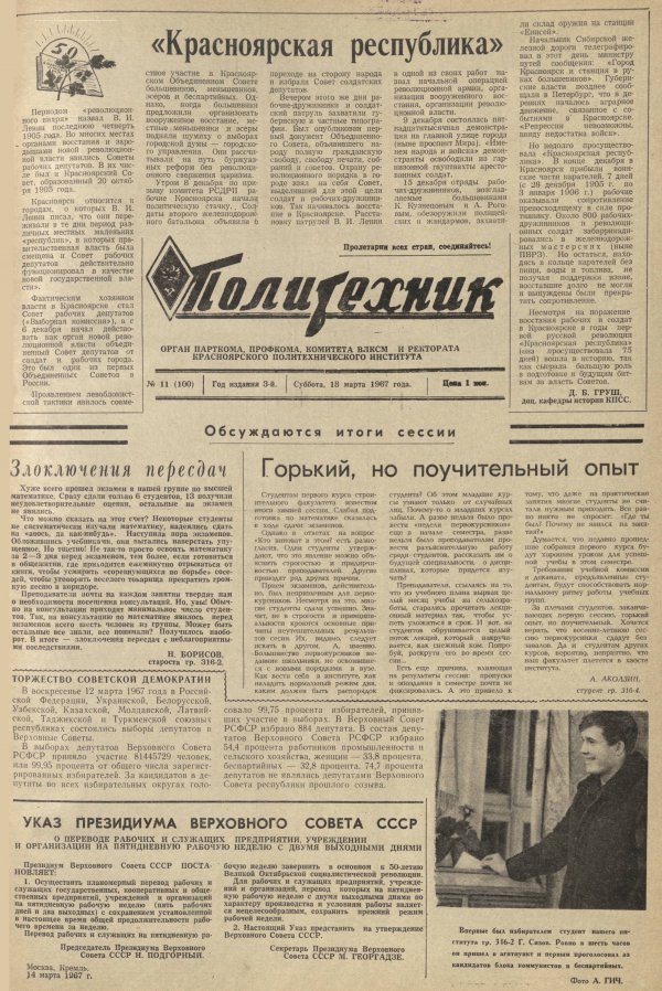 Политехник : газета. 1967 г. № 11 (100) (18 марта)