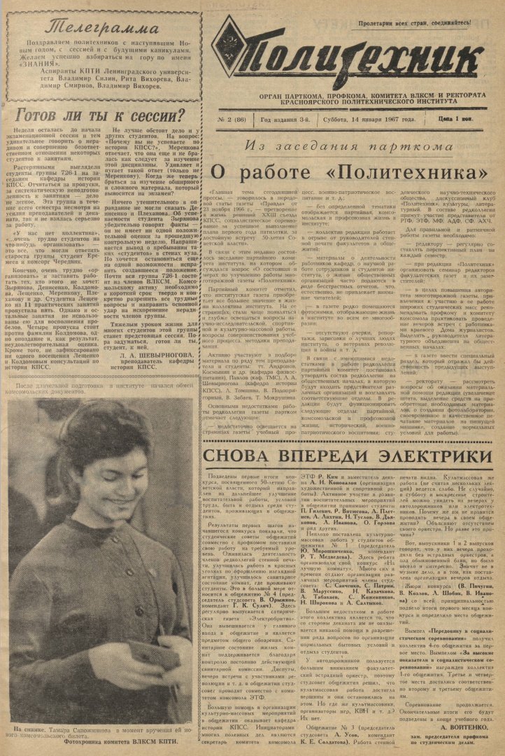 Политехник : газета. 1967 г. № 2 (86) (14 января)