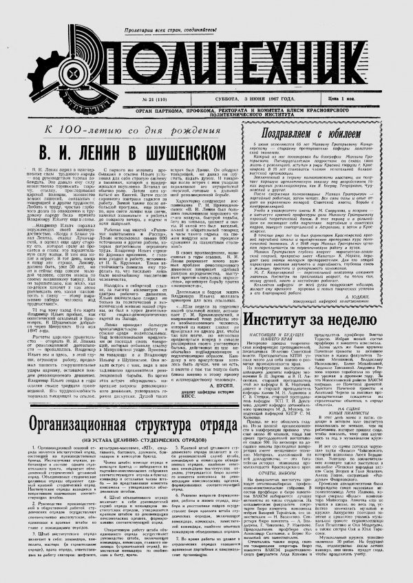 Политехник : газета/ Краснояр. политех. ин-т. - Красноярск : КГТУ, 1964 - - 2006 1967г. N 21 (110) (3 июня) http://lib3.sfu-kras.ru/ft/LIB2/ELIB_DC/SFUPRSV/sfupol/1967/1967_06_03_0110.pdf