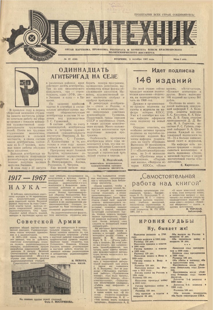Политехник : газета. 1967 г. № 27 (116) (3 октября)