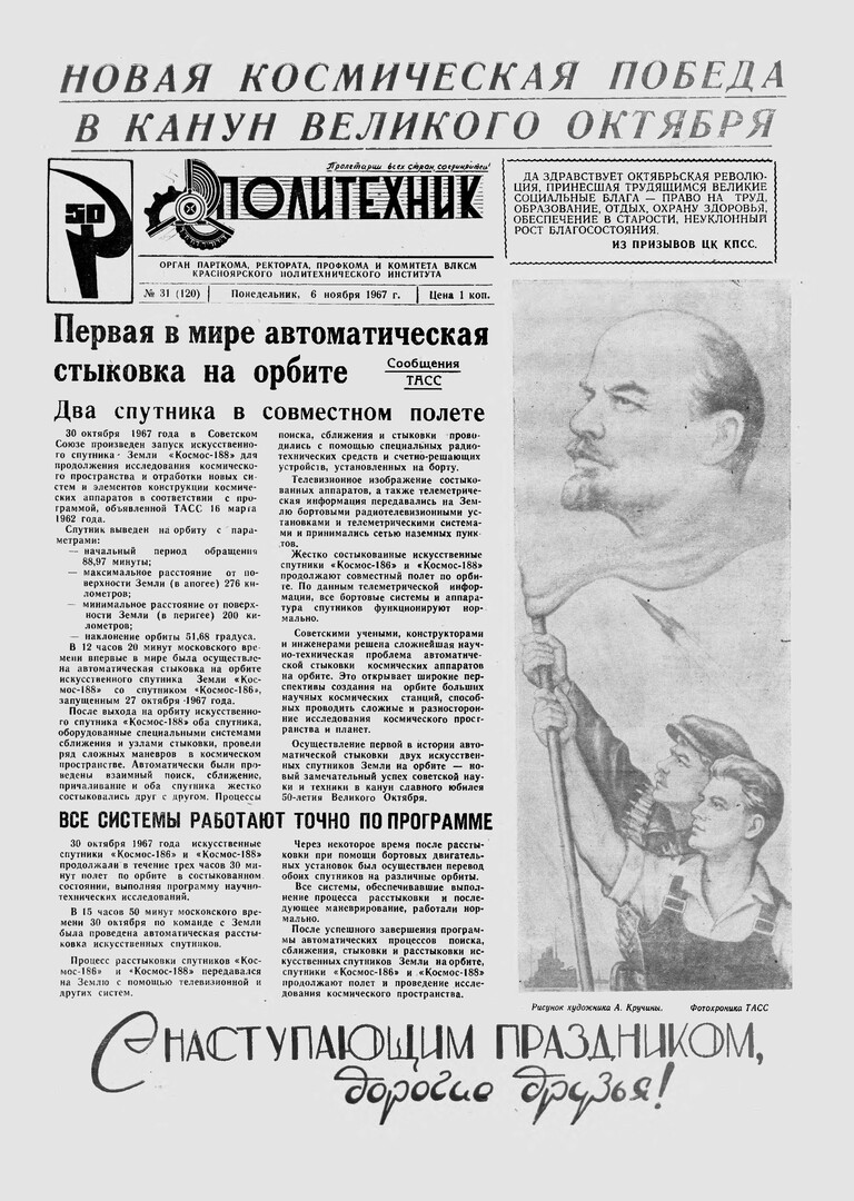 Политехник : газета/ Краснояр. политех. ин-т. - Красноярск : КГТУ, 1964 - - 2006 1967г. N 31 (120) (6 ноября) http://lib3.sfu-kras.ru/ft/LIB2/ELIB_DC/SFUPRSV/sfupol/1967/1967_11_06_0120.pdf