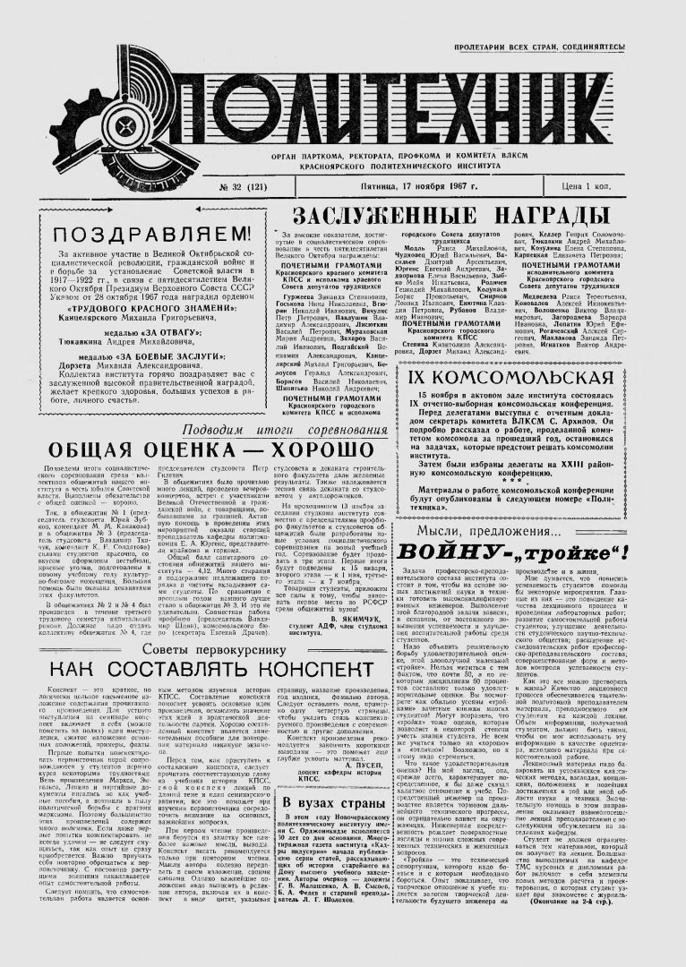 Политехник : газета/ Краснояр. политех. ин-т. - Красноярск : КГТУ, 1964 - - 2006 1967г. N 32 (121) (17 ноября) http://lib3.sfu-kras.ru/ft/LIB2/ELIB_DC/SFUPRSV/sfupol/1967/1967_11_17_0121.pdf