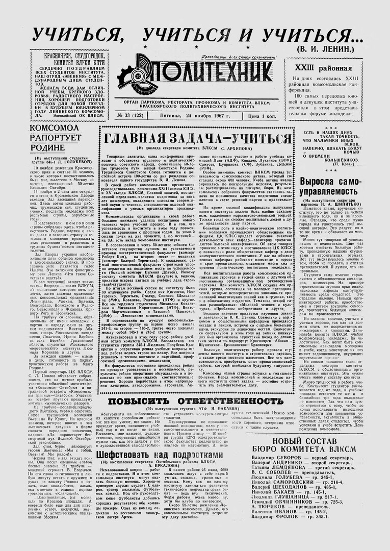 Политехник : газета/ Краснояр. политех. ин-т. - Красноярск : КГТУ, 1964 - - 2006 1967г. N 33 (122) (24 ноября) http://lib3.sfu-kras.ru/ft/LIB2/ELIB_DC/SFUPRSV/sfupol/1967/1967_11_24_0122.pdf