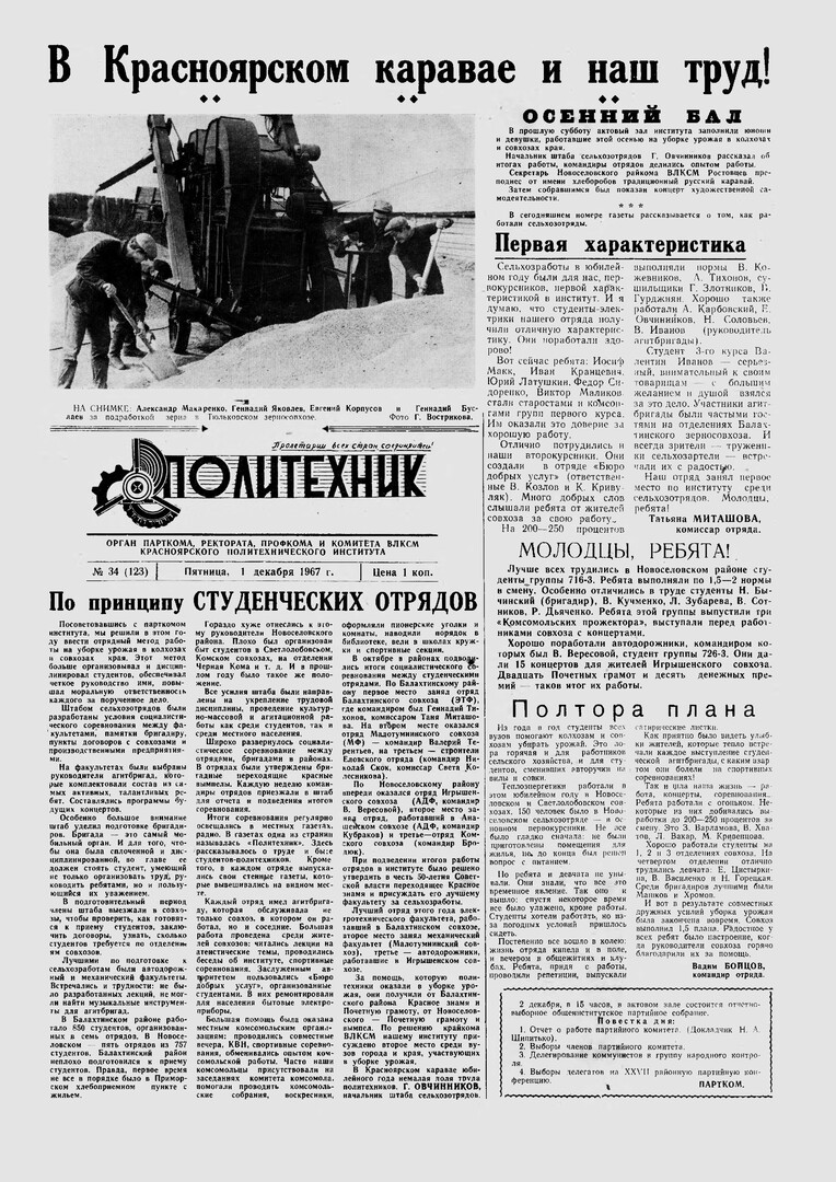 Политехник : газета/ Краснояр. политех. ин-т. - Красноярск : КГТУ, 1964 - - 2006 1967г. N 34 (123) (1 декабря) http://lib3.sfu-kras.ru/ft/LIB2/ELIB_DC/SFUPRSV/sfupol/1967/1967_12_01_0123.pdf