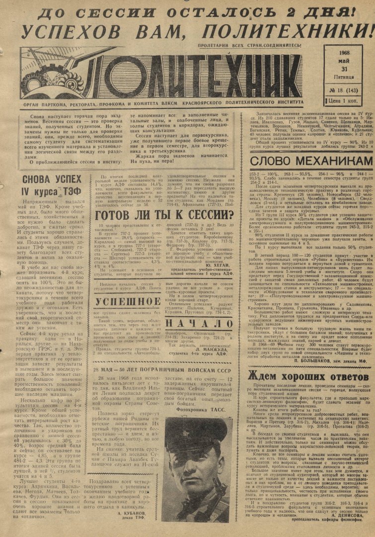 Политехник : газета. 1968 г. № 18 (143) (31 мая)